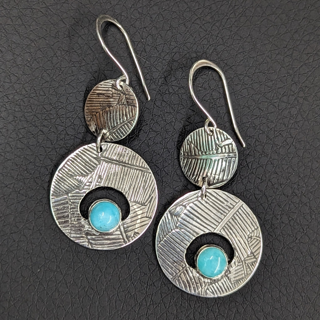 These gorgeous handmade earrings in textured sterling silver reminiscent of tropical palm trees are accented with brilliant 6mm blue-green amazonite stones. The total length of the earrings including sterling ear wires is approximately 2".