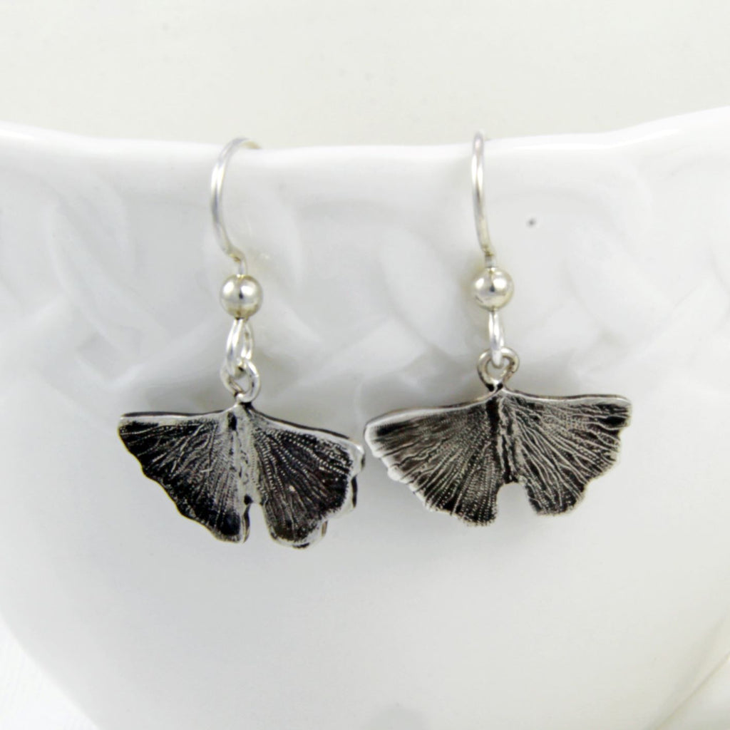 These earrings feature hand-fabricated sterling silver Ginkgo leaves, textured to show the interesting vein pattern, with sterling silver ear wires. For centuries, the Ginkgo, or Maidenhair Tree, has served as a symbol of hope and peace in its native land of China. The Ginkgo is the oldest tree species in the world.. Fossils very similar to the living species, belonging to the genus Ginkgo, extend back to the Middle Jurassic approximately 170 million years ago. I admire this tree for it's resilience and its brilliant yellow fall colors.