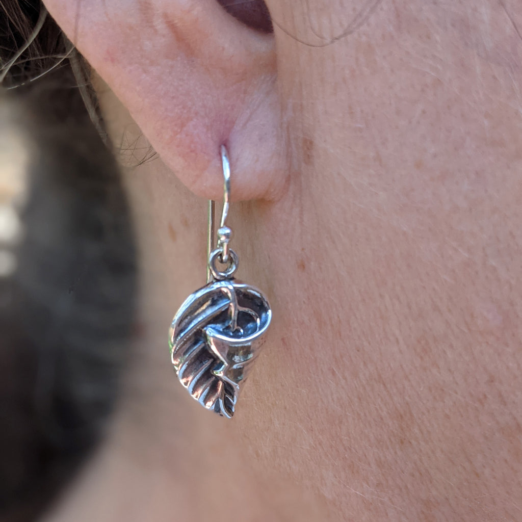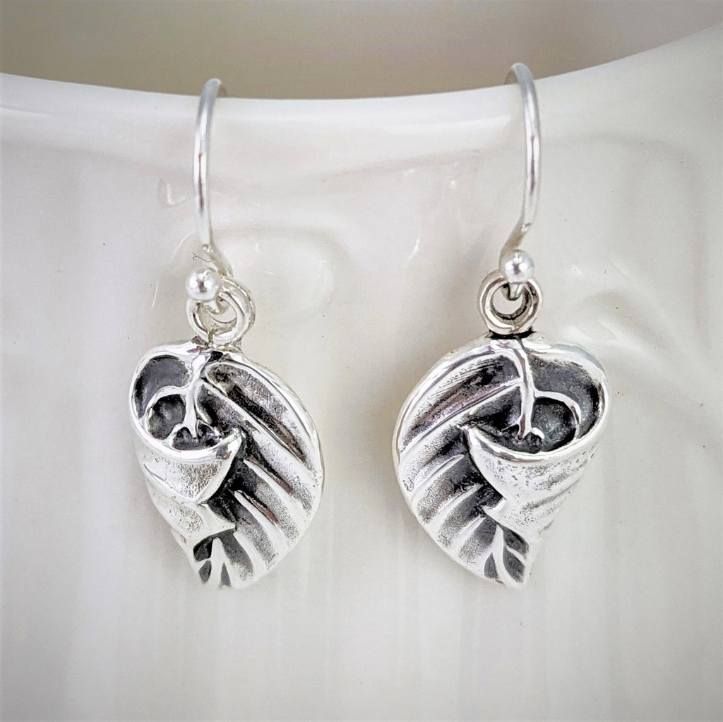 Reminiscent of crisp fall days, these earrings feature leaves fallen from the tree and beginning to curl on the edges. They are die struck in sterling silver with an antique patina and hand polished finish, and argentium silver ear wires.