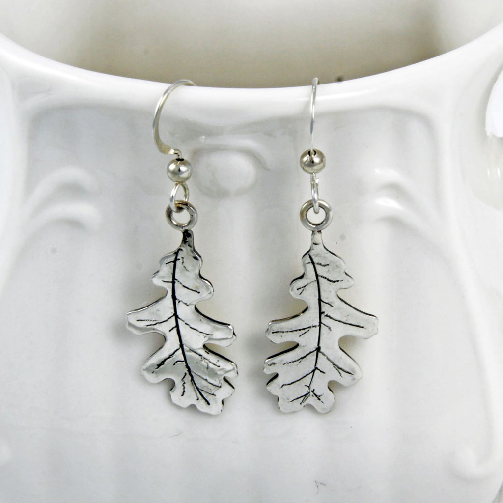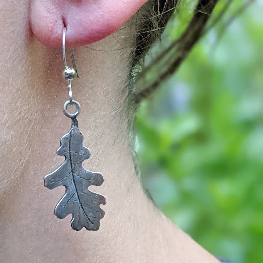 Hand-crafted 1 inch long sterling silver oak leaves with hand-stamped pattern and sterling silver earwires. Oaks are among my favorite trees, and these are a hybrid of White Oaks and Blue Oaks that grow around my home in the Sierra Nevada foothills of California.