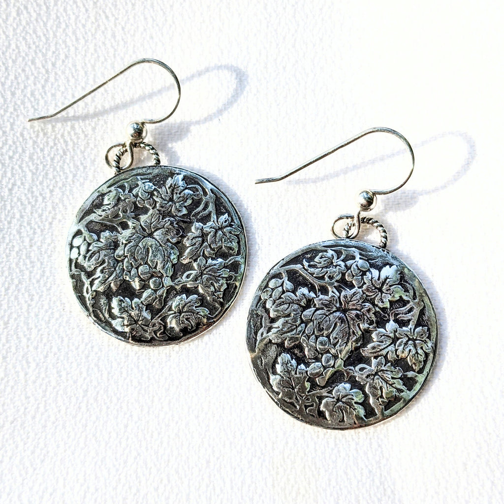 These sterling silver earrings are embellished with a die struck design of grape leaves and grapes that reminds me of the many small vineyards and wineries near my home in the Sierra Nevada foothills of California.
